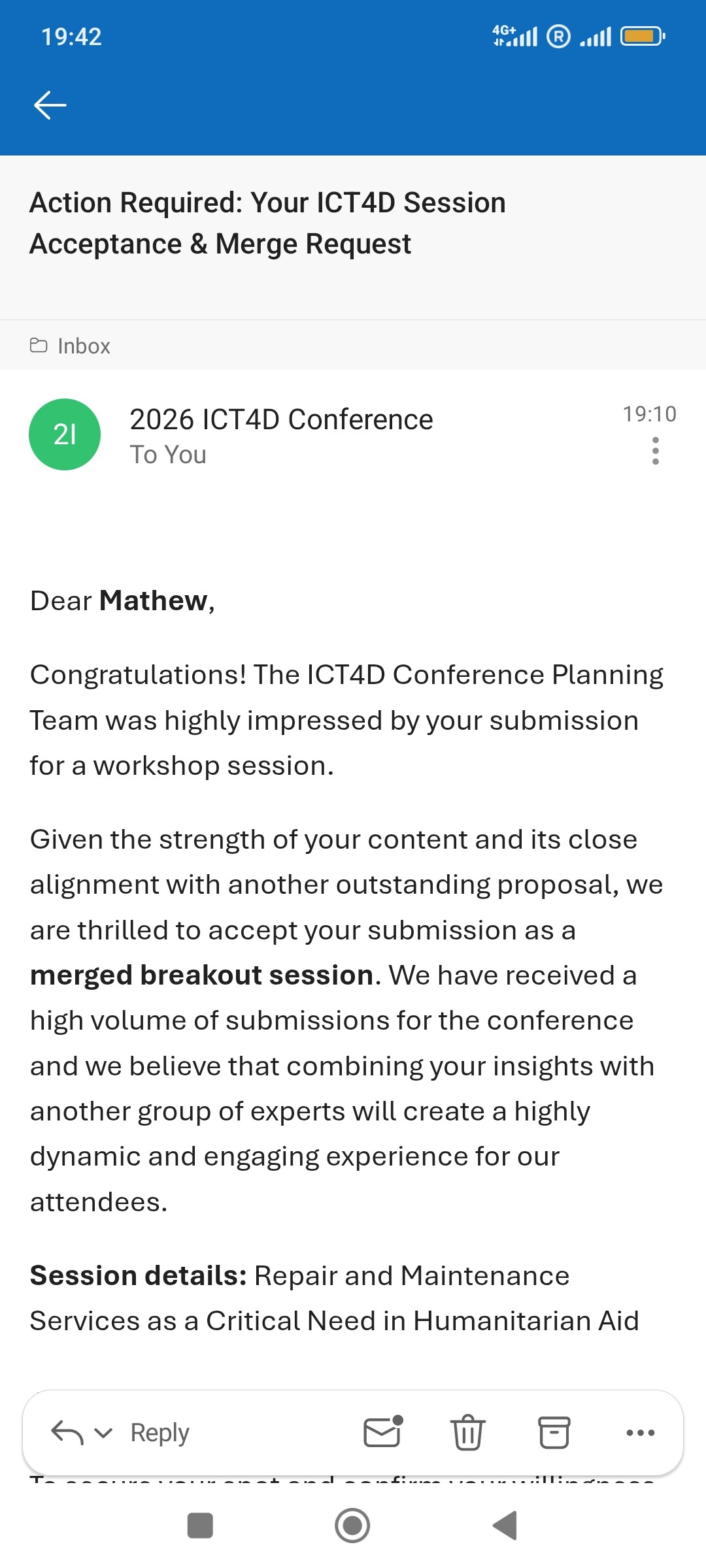 My workshop on “Repair and Maintenance Services as a Critical Need in Humanitarian Aid” has been accepted as a merged breakout session at the ICT4D Conference 2026 in May from 20-22 in Nariobi Kenya.