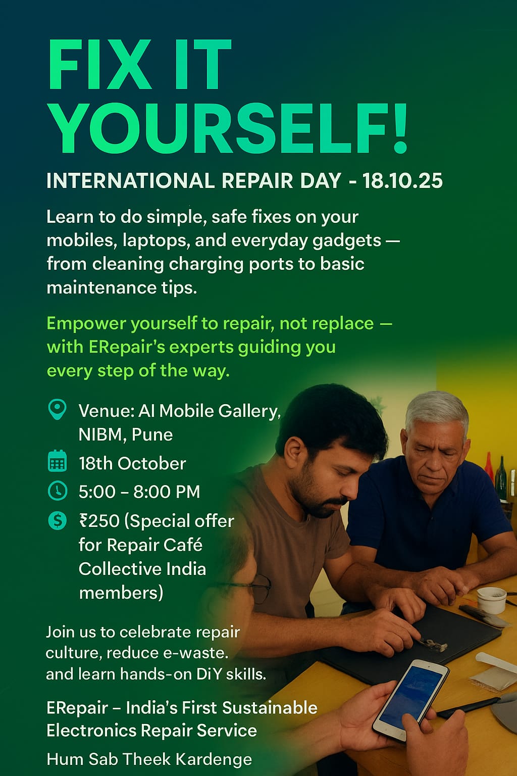 www.erepairs.in — the city’s first AI-powered sustainable repair service — is hosting a hands-on session where you can learn simple and safe fixes for your mobiles, laptops, and everyday gadgets. From cleaning charging ports to mastering basic maintenance tips, this is a must-attend for every repair enthusiast!